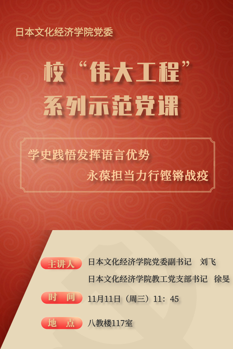 我院党委高度重视加强党员、入党积极分子教育工作,并将学生党员发展工作与新生教育有机结合。按照上级有关要求和年度工作计划,我院党委充分依托学院自身资源优势,立足文化传统、学科特色和党员特点,11月11日,日本文化经济学院党委副书记刘飞老师、院教工党支部书记徐旻老师以“学史践悟发挥语言优势,永葆担当力行铿锵战疫”为主题,为我院2020级新生带来了一堂深刻动人的示范党课。