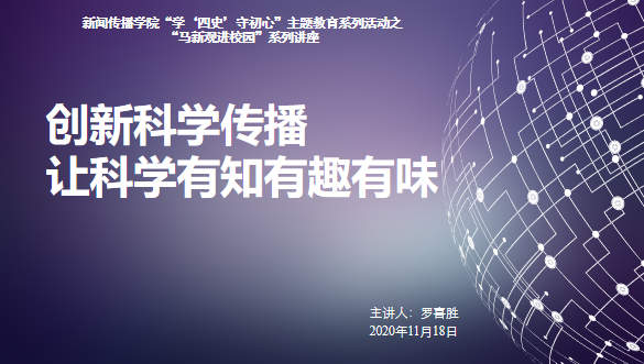 11月18日下午,新闻传播学院举办了“学‘四史’ 守初心”主题教育系列活动之“马新观进校园”系列讲座。本次讲座邀请到了中国科学技术大学副校长,流体力学教授,博士生导师罗喜胜,罗教授为同学们带来了一场以“创新科学传播——让科学有知有趣有味”为主题的线上讲座。新闻传播学院党委书记樊娟主持了讲座。