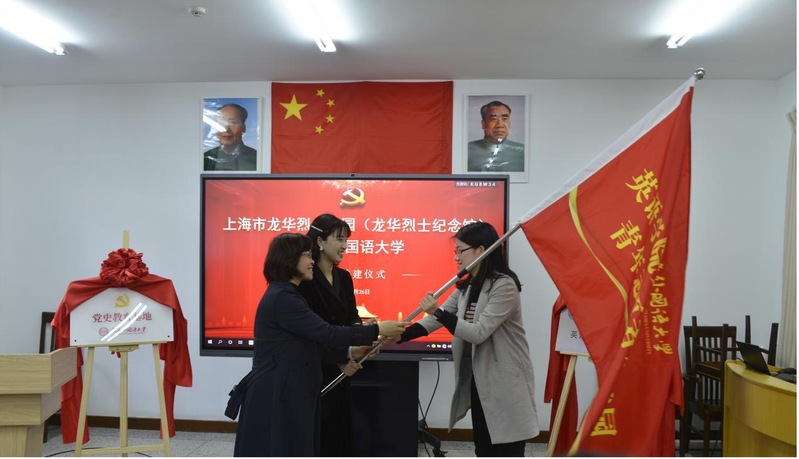 上外英语学院党委书记杨雪莲老师、龙华烈士纪念馆社教部部长丛雪娇副研究员为“上海外国语大学英语学院龙华烈士陵园青年志愿者服务队”授旗