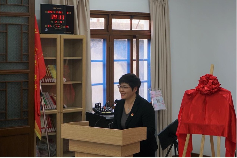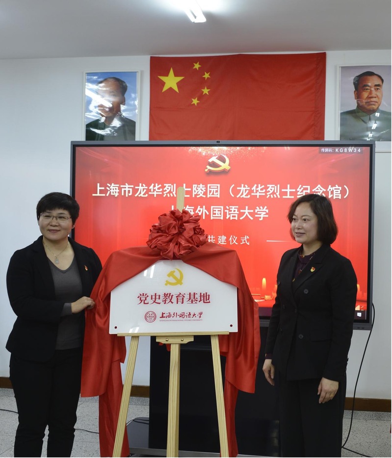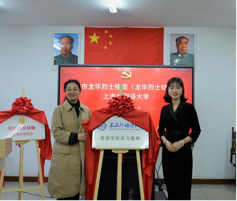 上外英语学院院长王欣教授、龙华烈士纪念馆社教部部长丛雪娇副研究员为“上海外国语大学英语学院实习实践基地”揭牌