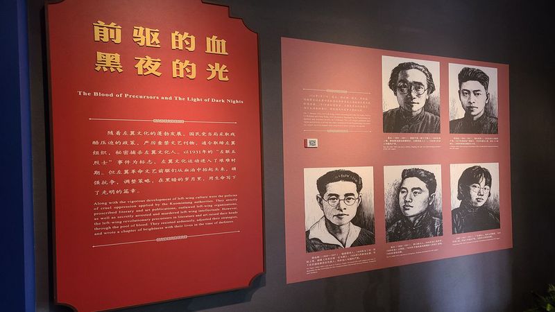 中国左翼作家联盟会址纪念馆坐落于上外虹口校区附近多伦路文化名人街,庭院内伫立着“左联”五烈士的雕像,一楼是成立大会原址,再现了91年前左联成立时的场景;二楼和三楼的两大展区分为四个部分——“左翼文化策源地”“前驱的血 黑夜的光”“左翼文化 星火燎原”“红色经典 灿烂篇章”,陈列着大量珍贵的历史图片、实物及左翼文艺作品。党员同志们一边参观学习,一边聆听党课,王玄老师深入浅出的讲解,使大家深入了解了上世纪二三十年代,以鲁迅先生为代表的左翼人士在那段黑暗与压迫交织的岁月中,以上海为革命基地,不畏艰险,顽强抗争,为争取民族独立、为自由解放奔走的峥嵘岁月和波澜壮阔的奋斗历程。左翼文化先驱们面对国民党当局的围剿以笔为枪、英勇无畏的精神使党员们接受了一次深刻的心灵洗礼。
