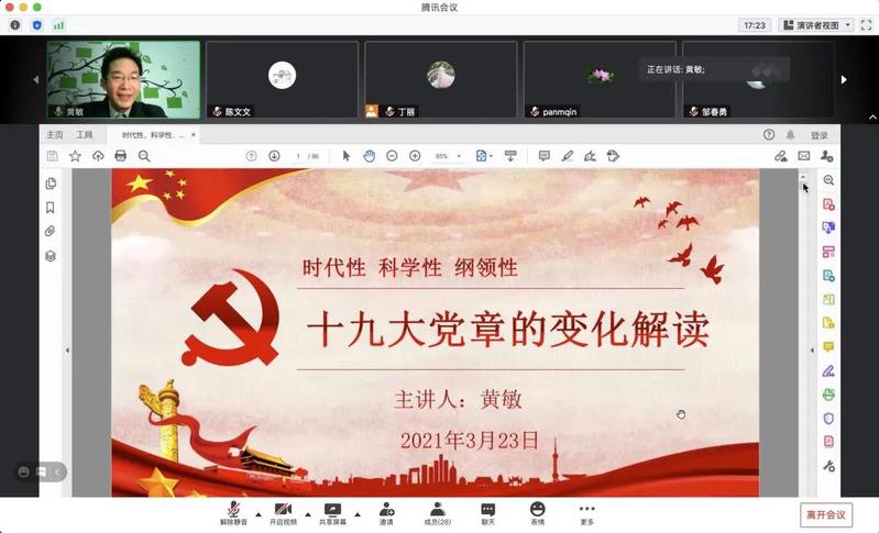 为准确把握党建工作要点,夯实师生理论学习的常态化建设,充分发挥党支部战斗堡垒作用,进一步增强“四个意识”、坚定“四个自信”、坚决做到“两个维护”,始终在思想上政治上行动上同以习近平同志为核心的党中央保持高度一致,3月23日下午,国际工商管理学院党委特邀上海立信会计金融学院人文艺术学院党总支书记黄敏老师为师生党员带来《时代性、学性、纲领性——十九大党章的变化解读》的专题党课。学院党委书记徐永、副书记汪丽以及各师生党员线上聆听了本次党课。