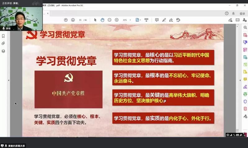 为帮助各位教工党员更加深入了解、精准掌握党章,黄敏书记从十九大对党章的修改、党章的概述、党章的发展历程、党章的总纲、党章的条文以及如何学习和遵守党章六个部分,系统解读了十九大以来党章的变化,;并着重讲解了党的总纲和党的条文部分。
