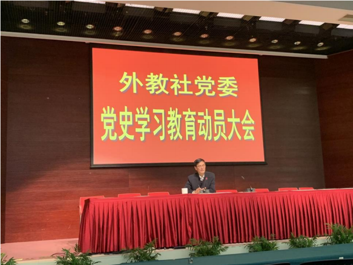 2021 年 4 月 2 日下午,外教社党委组织全体党员在 10 楼报告厅召开党史学习教育动员大会暨本学期党委书记上党课。外教社党委书记孙玉同志和大家一起学习了习近平总书记在党史学习教育动员大会上的重要讲话。回顾了教育部党组和上外党委对党史学习教育的工作部署。最后对外教社党史学习教育提出了工作要求。