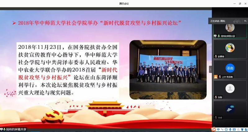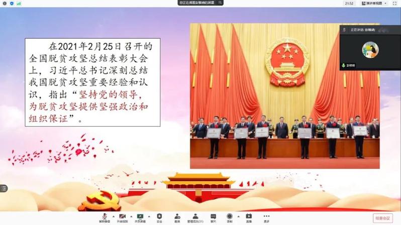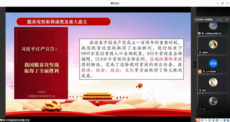 活动伊始,上外英语学院研究生第七党支部彭雅靖同学介绍了党中央关于脱贫攻坚的理论决策。自党的十八大以来,以习近平同志为核心的党中央将脱贫攻坚摆在治国理政的突出位置,并立足我国国情,把握减贫规律,走出了一条具有中国特色的脱贫攻坚道路。华师外国语学院“语思”研究生党支部颜瑜同学从经济、社会、政治、文化、教育、乡村振兴及国际影响等方面,向全体参会人员展示了我国脱贫攻坚事业所取得的伟大成果,以及脱贫攻坚战取得全面胜利的重大意义。双方支部成员一致认为,脱贫攻坚战的全面胜利既是伟大的历史性成就,也意味着新的机遇与挑战。因此,我们要更加紧密地团结在党中央周围,坚定信心决心,以永不懈怠的精神状态、一往无前的奋斗姿态,真抓实干、埋头苦干,向着实现第二个百年奋斗目标奋勇前进!