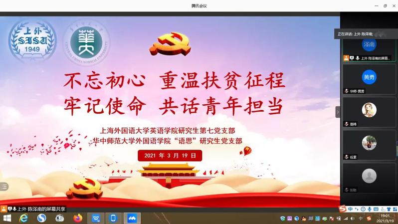 2021年3月19日,上海外国语大学英语学院研究生第七党支部与华中师范大学外国语学院“语思”研究生党支部联合开展以“不忘初心,重温扶贫征程;牢记使命,共话青年担当”为主题的共建活动,双方支部全体党员通过线上会议形式参与了此次活动。活动由上外英语学院研究生第七党支部陈泽南主持。
