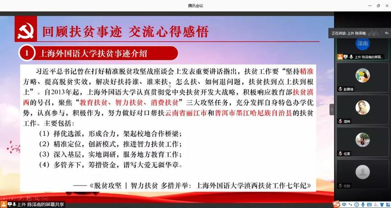 我国脱贫攻坚事业不仅有理论政策的支持,更已付诸行动,落在实处,在祖国大地上生根发芽。在第二环节中,与会成员回顾了双方高校在脱贫攻坚方面的先进事迹,以加深对上述理论成果的认识。上外英语学院研究生第七党支部陈泽南同学系统介绍了上外过去七年在“教育扶贫、智力扶贫、消费扶贫”三方面的具体实践,并通过扶贫主题短片《“语”你在一起》对上外扶贫事迹进行了总结回顾。