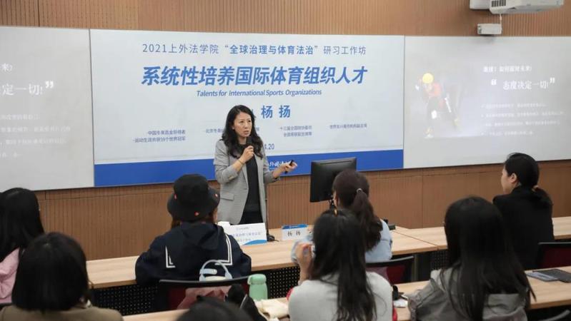4月20日,上海外国语大学法学院“全球治理与体育法治”研习工作坊第一讲在松江校区顺利举行。中国冬奥会首金获得者、世界反兴奋剂机构副主席、原国际奥委会委员杨扬为全体学员作了题为“系统性培养国际体育组织人才”的精彩讲座。法学院院长张海斌主持讲座。