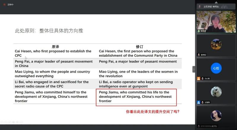 于敏:我自己在翻译的时候只考虑要将内容具体化、客观化,删除一些无谓的修饰语,力求使读者看懂每句话的意思。老师们指出了许多我没有注意到的问题,给了我很多启发,包括找出原文的线索、重构故事以保证叙事效率,根据读者的身份选择文字的表述方式,调整译文的措辞色彩,省略与合并高频名词,借鉴平行文本的写作,选择合适的辞格翻译策略等。由此,我意识到红色文本的翻译有其独特性,一味追求准确与通顺是不行的,意识形态、文化背景等方面的差异对译者提出了更高的要求。唯有将以上种种考量融入实践,红色文化才能够真正走出去。