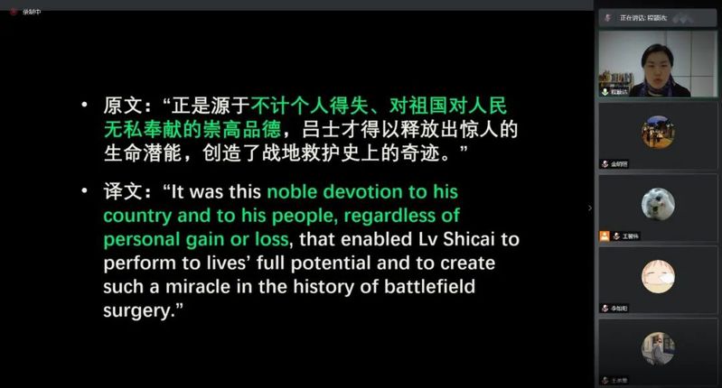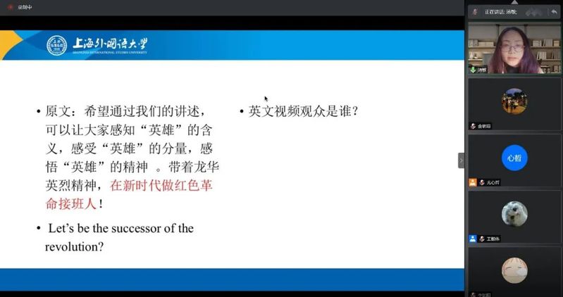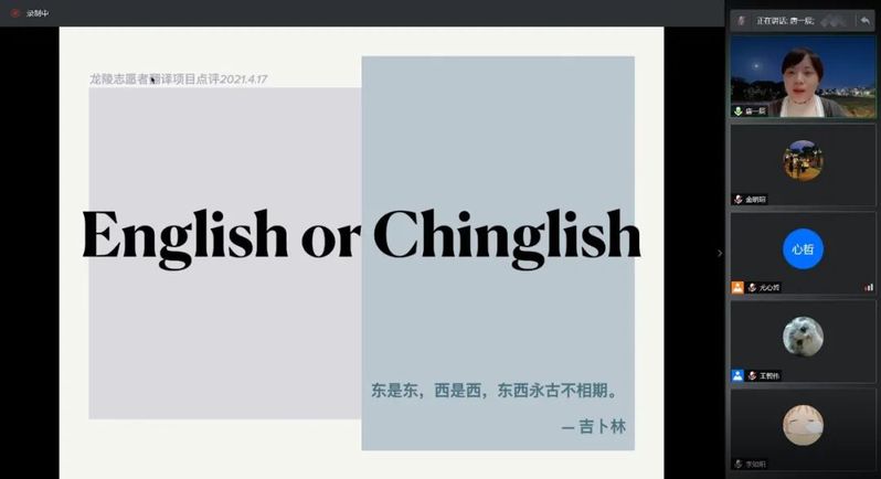 2021年4月17日,英语学院特别邀请到杨祎辰、汤敏、唐一辰、程颖洁、曹思宇五位老师,就上外英院龙陵青年志愿服务队的前期翻译作品进行了精彩的点评和指导,同学们受益良多。