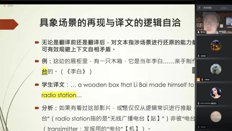 曹思宇老师以解决“特殊话语系统对于辞格翻译策略的影响”、“基于‘在场’交流的文化译介和语体切换”与“具体场景的再现与译文的逻辑自洽”三个问题展开分享。曹老师首先通过分析话语系统特征,强调了辞格使用与翻译策略的调整,随后就陵园展馆解说内容的语体特点提出了使用书面语体、注意语体切换与自然衔接、注意标点符号的表达效果等建议,最后对官方译名、组合名词、夸张手法的翻译方法做出补充。