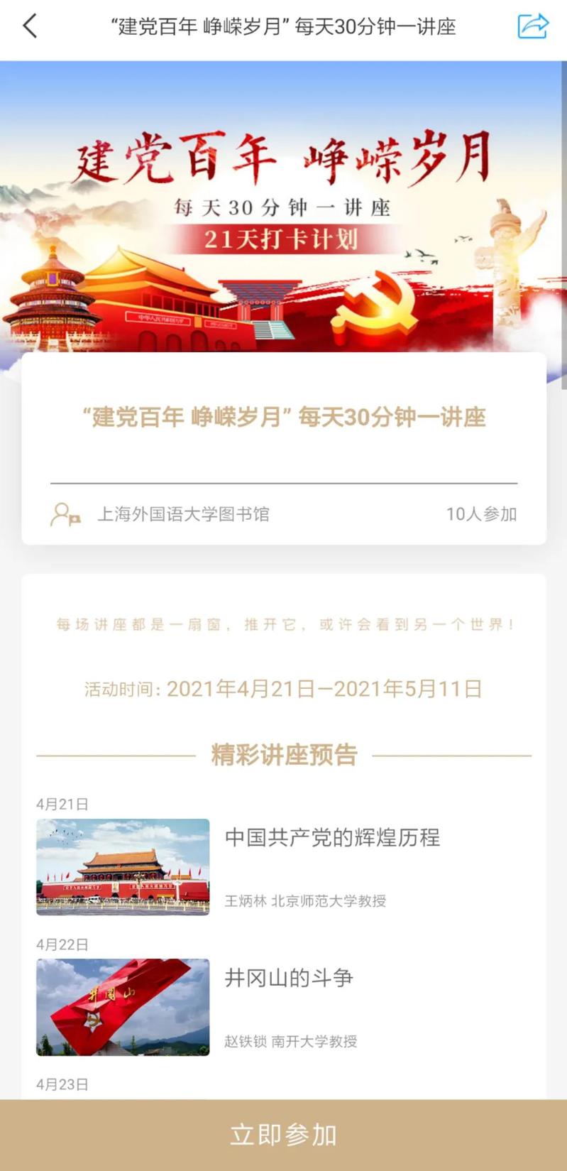 2021年是中国共产党建党100周年,建党伟业,道阻且艰,先辈们砥砺前行的红色精神,值得我们不断缅怀纪念。上海外国语大学图书馆联合超星名师讲坛,推出21天打卡活动(2021年4月21日-2021年5月11日),每天30分钟一讲座,名师云集,将军院士开讲,共同回顾百年峥嵘岁月。