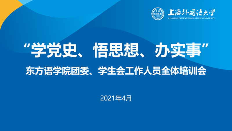 本次团委、学生会全体培训大会为东方语学院开展的党史学习教育系列活动之一,旨在东院团委、学生会全体学生干部深入学习党史教育,领悟相关思想,做到从同学中来、到同学中去,真正解决学生工作开展过程中遇到的问题,做到学史明理、学史增信、学史崇德、学史力行。学院未来将会持续深入贯彻党史学习教育动员大会相关精神,做好党史学习教育工作。