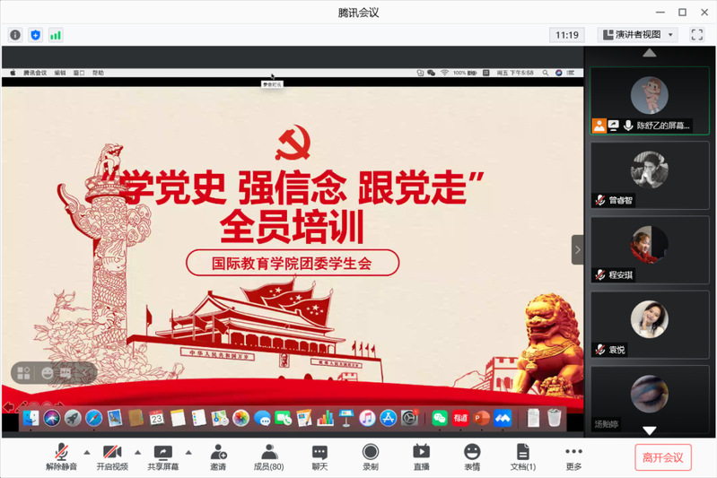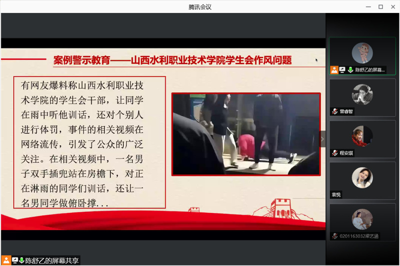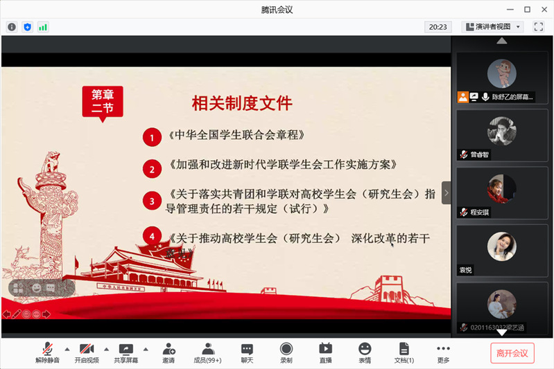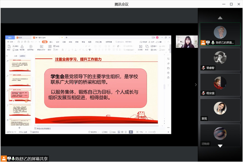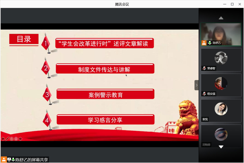 为深入学习贯彻习近平总书记致全国青联十三届全委会和全国学联二十七大的贺信和党中央致辞精神,传达学习中央有关会议精神,落实团十八届五中全会要求,加强和改进新时代学联学生会工作部署,2021年4月23日,国际教育学院团委学生会组织开展“学党史、强信念、跟党走”学习教育活动,在线上对我院学生会全体成员进行全员培训。会议主要内容包括“学生会改革进行时”述评文章解读、制度文件传达和讲解、案例警示教育和学习感言分享。