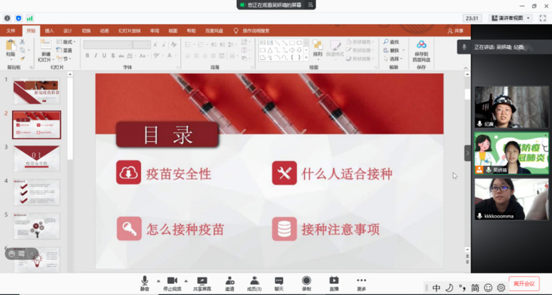 由于缺乏对疫苗相关信息的了解,部分群众持犹豫态度。经过前期的调查和准备,吴妍靖同志为身边正在隔离的归国朋友们开展了线上新冠疫苗知识科普活动,从疫苗的安全性、什么人适合接种、怎么接种疫苗和接种注意事项这四个方面,进行了详细具体的说明。参与者均表示收获良多,并有意愿预约接种新冠疫苗。