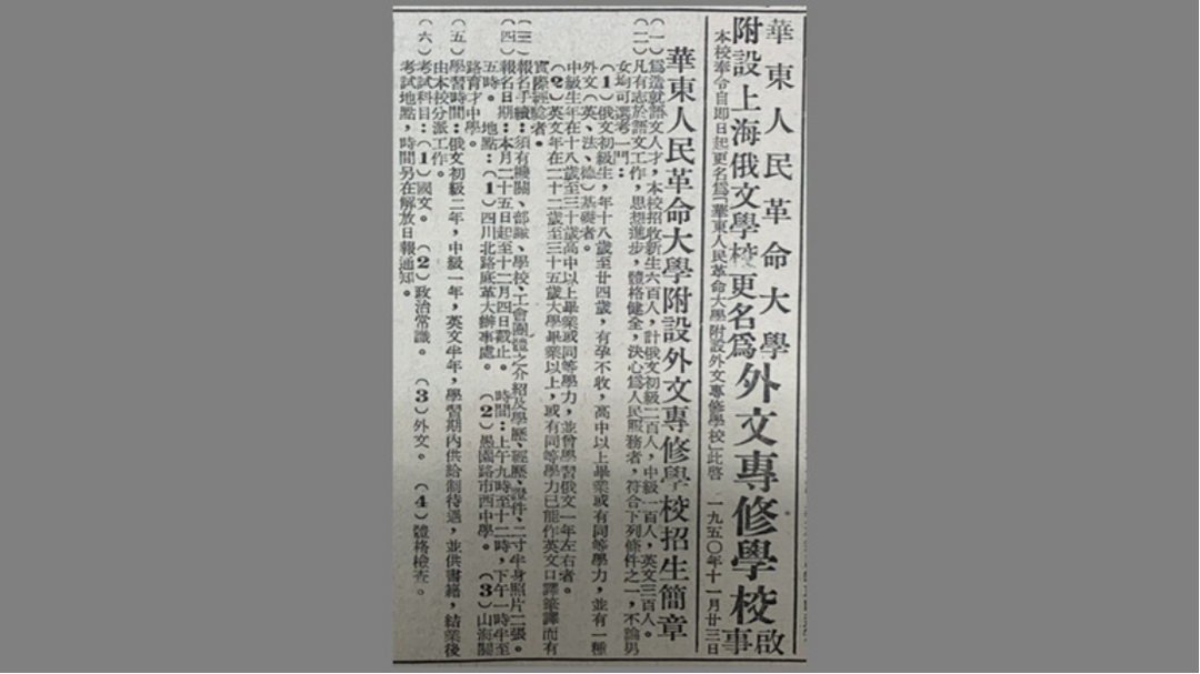 1950年6月25日,朝鲜战争爆发。因当时在朝抗战的部队急需英语翻译人才,根据国家形势所需,华东人民革命大学附设上海俄文学校在陈毅市长的指示下,拟在原有俄语专业的基础上增设英文班,并于1950年11月23日在《解放日报》同时刊登了更名为“华东人民革命大学外文专修学校”的启事与招生简章。最终录取了有英文基础的学员共计90名。